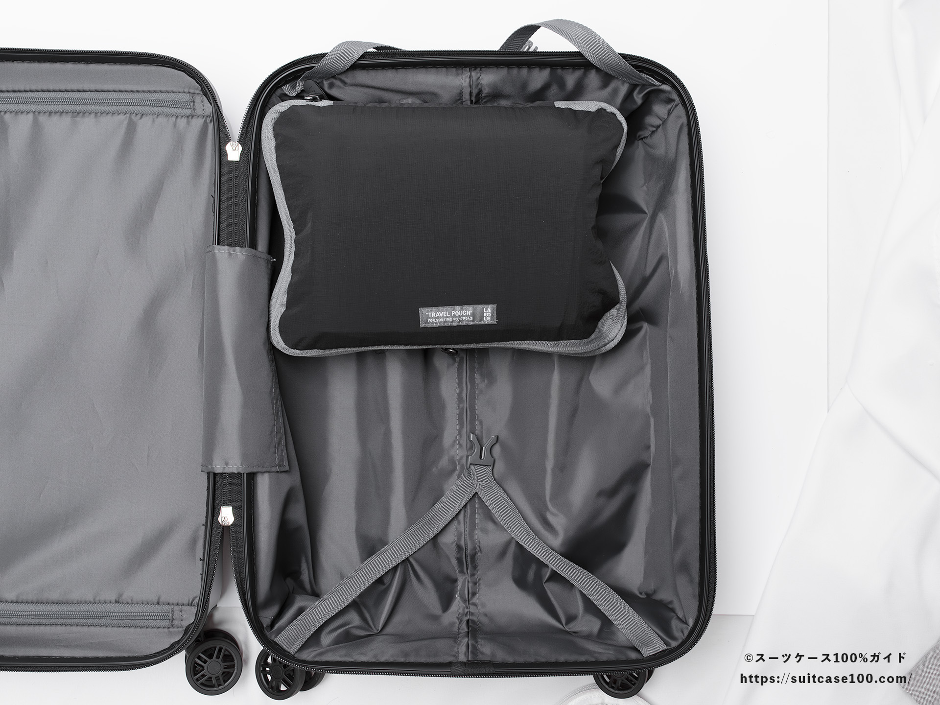 Sサイズ(機内持ち込みサイズ)のスーツケースに入れた図です。