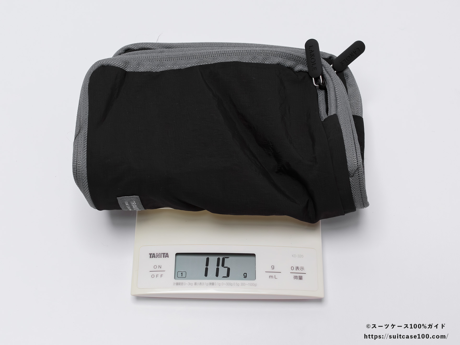 Sサイズで115gはトラベル圧縮ポーチとしては標準的。