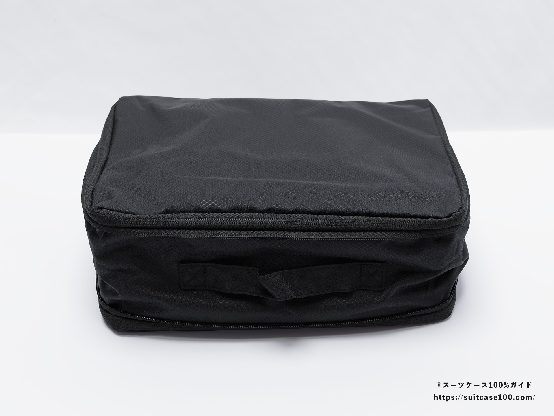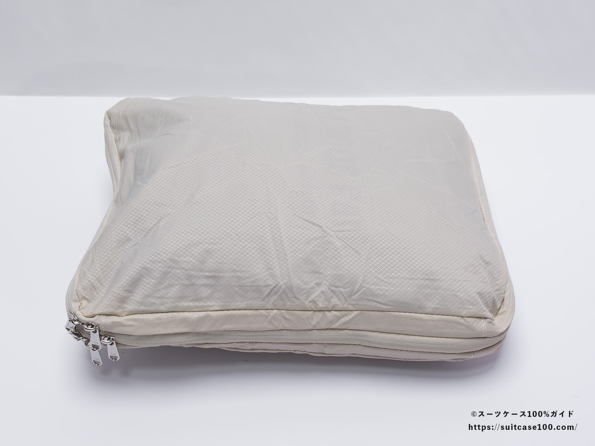 体重で押さえて圧縮用ファスナーを閉めるのが楽。