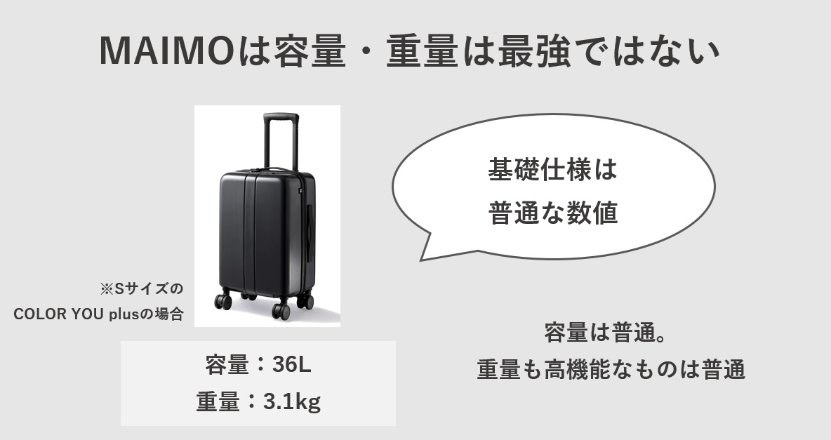 MAIMOは容量は普通。高機能なものは重量がやや悪い。