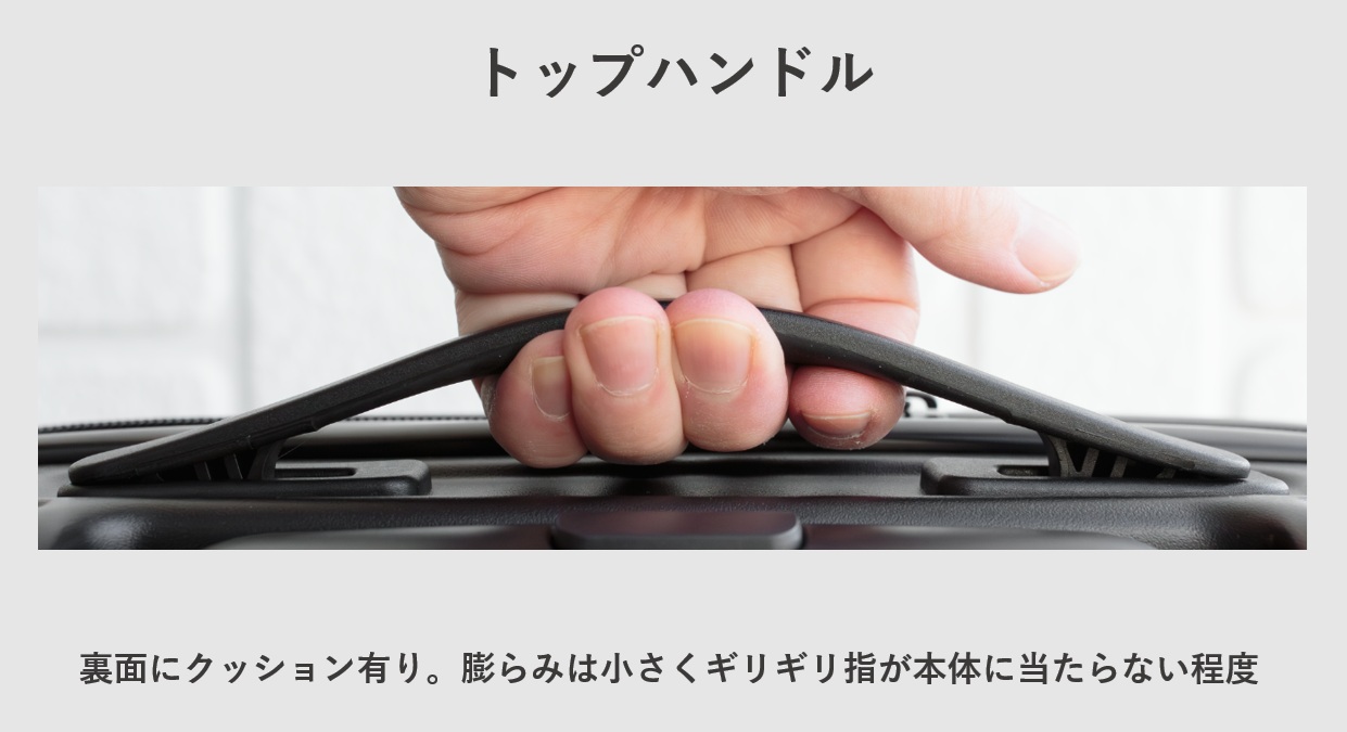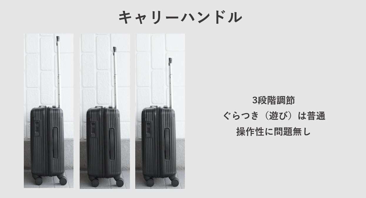 | キャリーハンドル | 〇 | ぐらつき普通。3段階調節 |