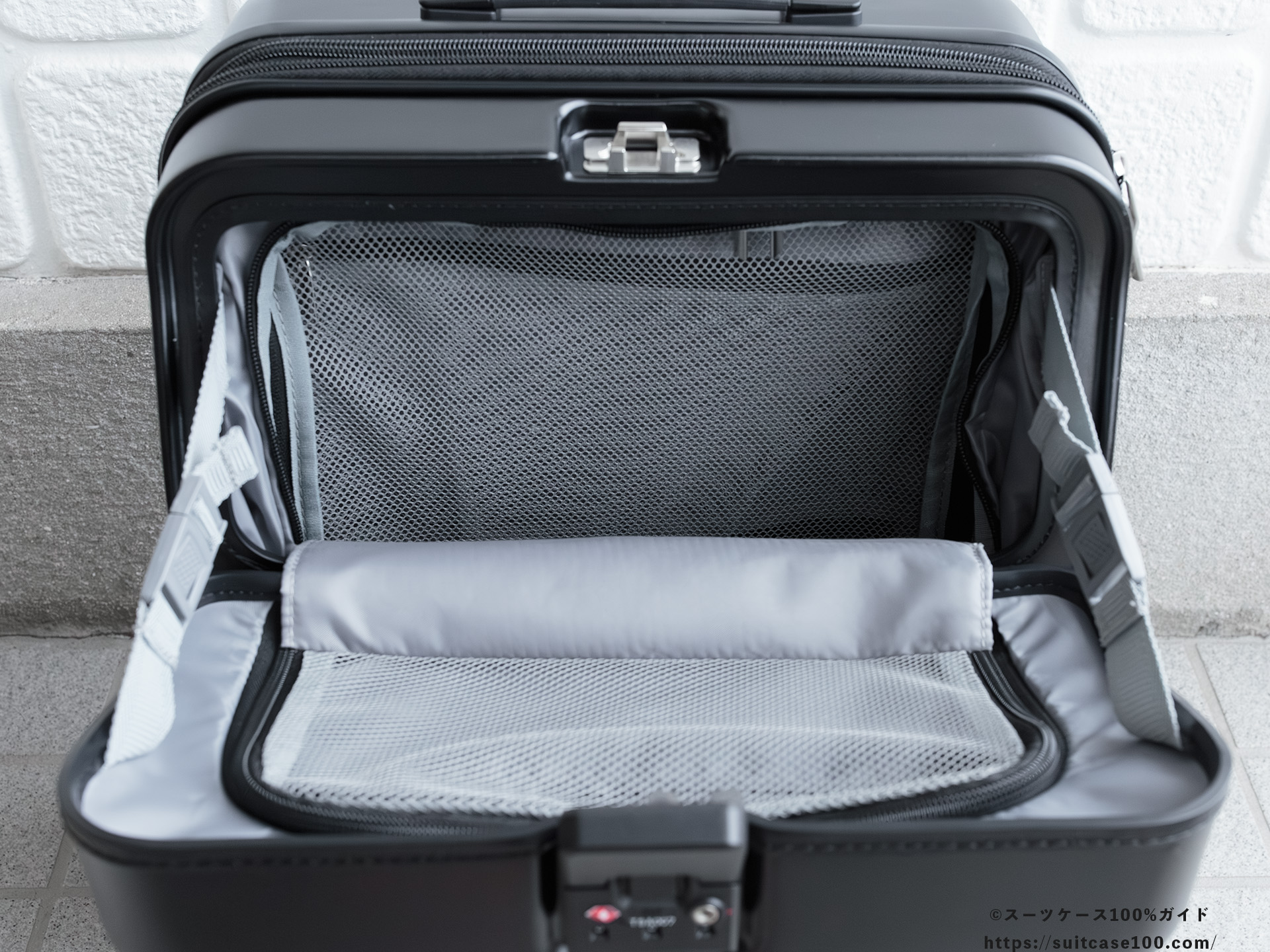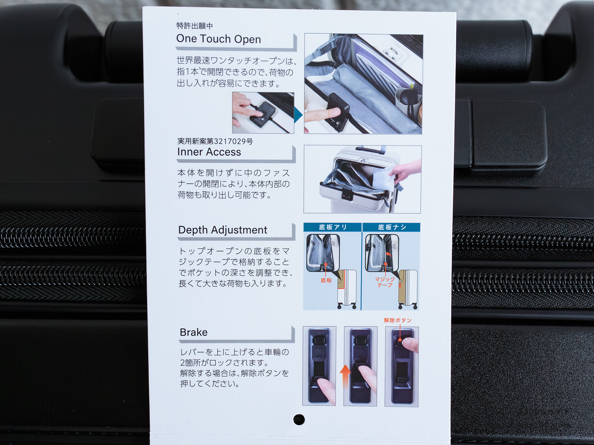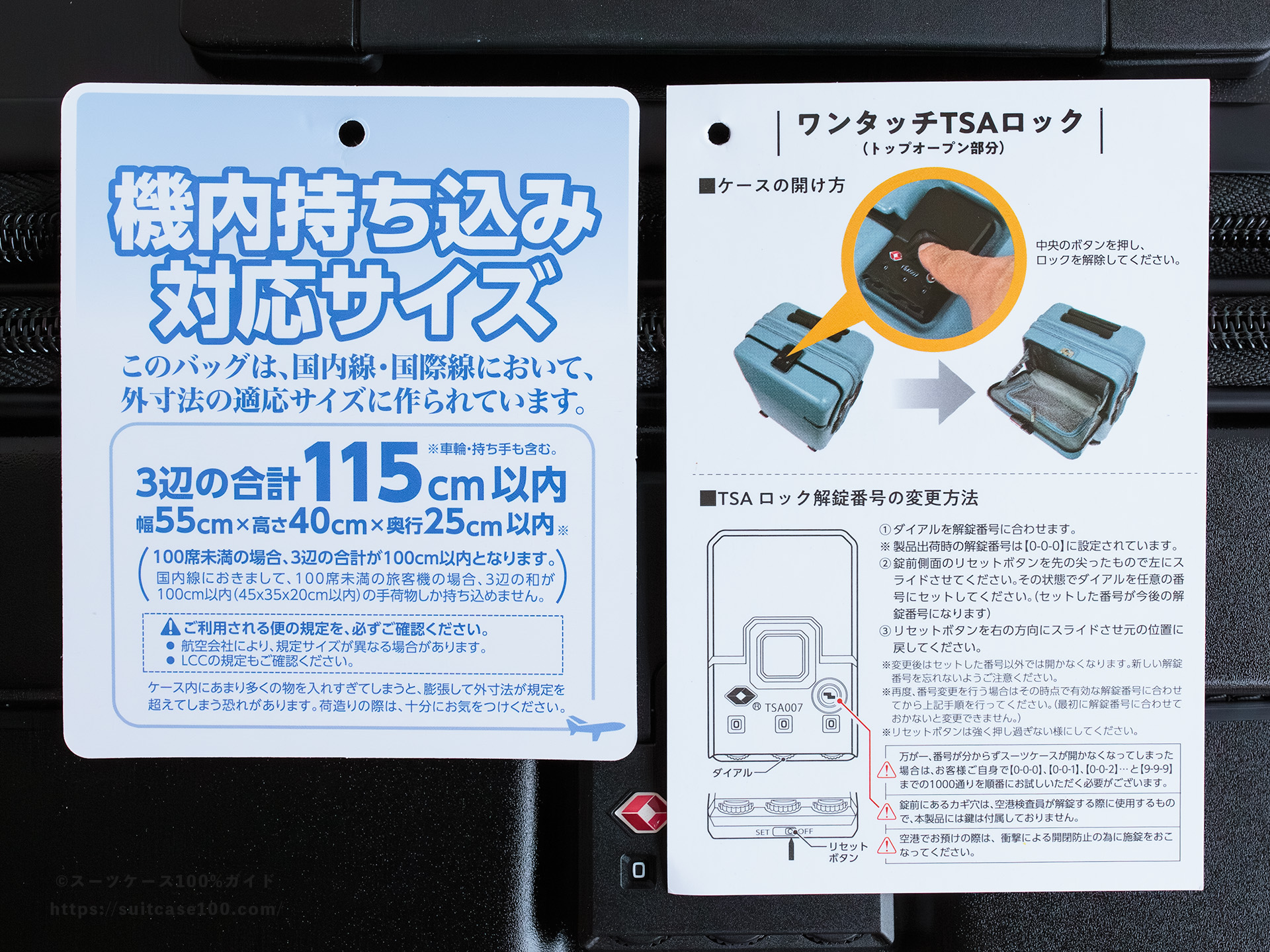 機内持ち込みとワンタッチTSAロックの説明。