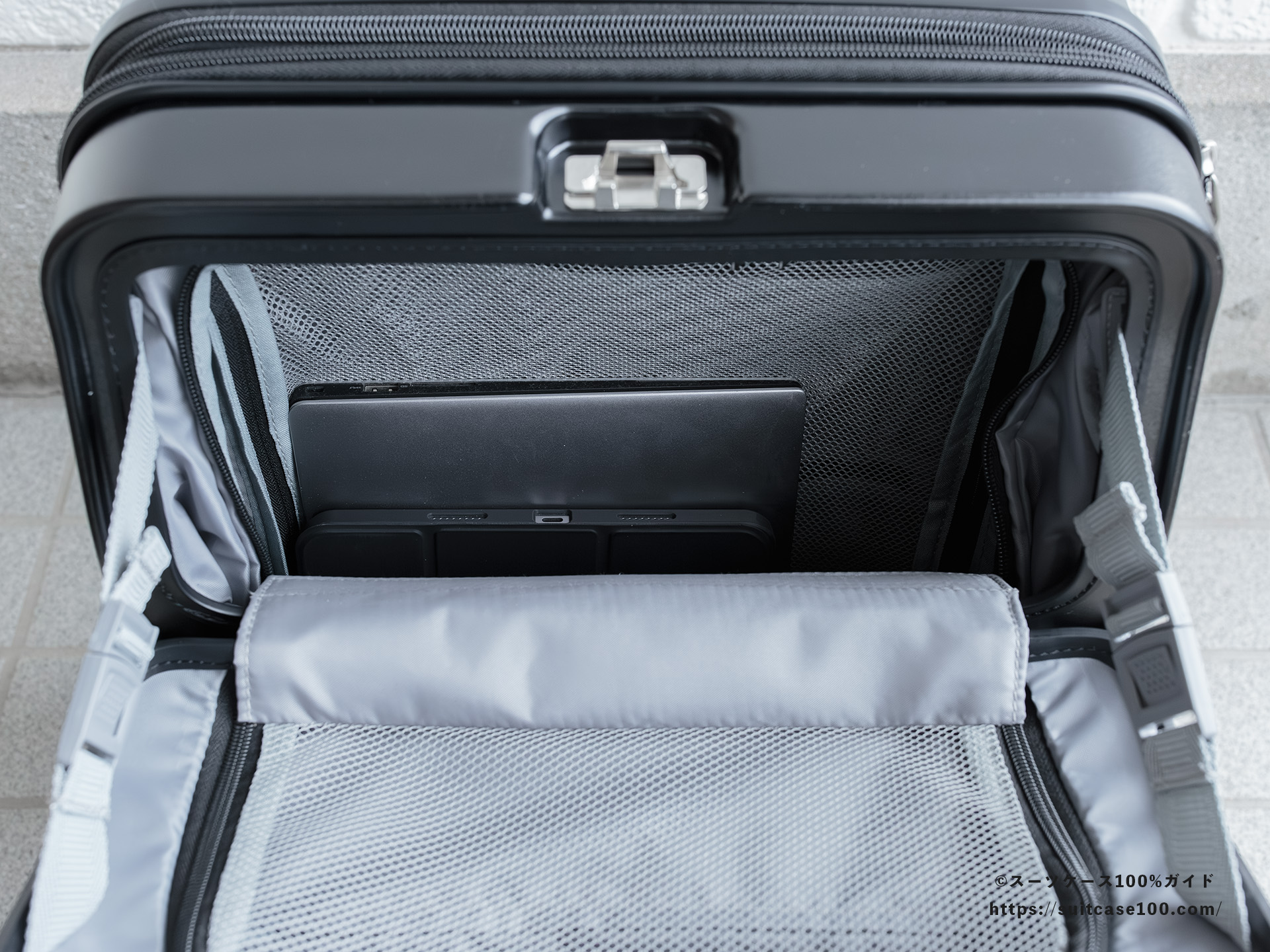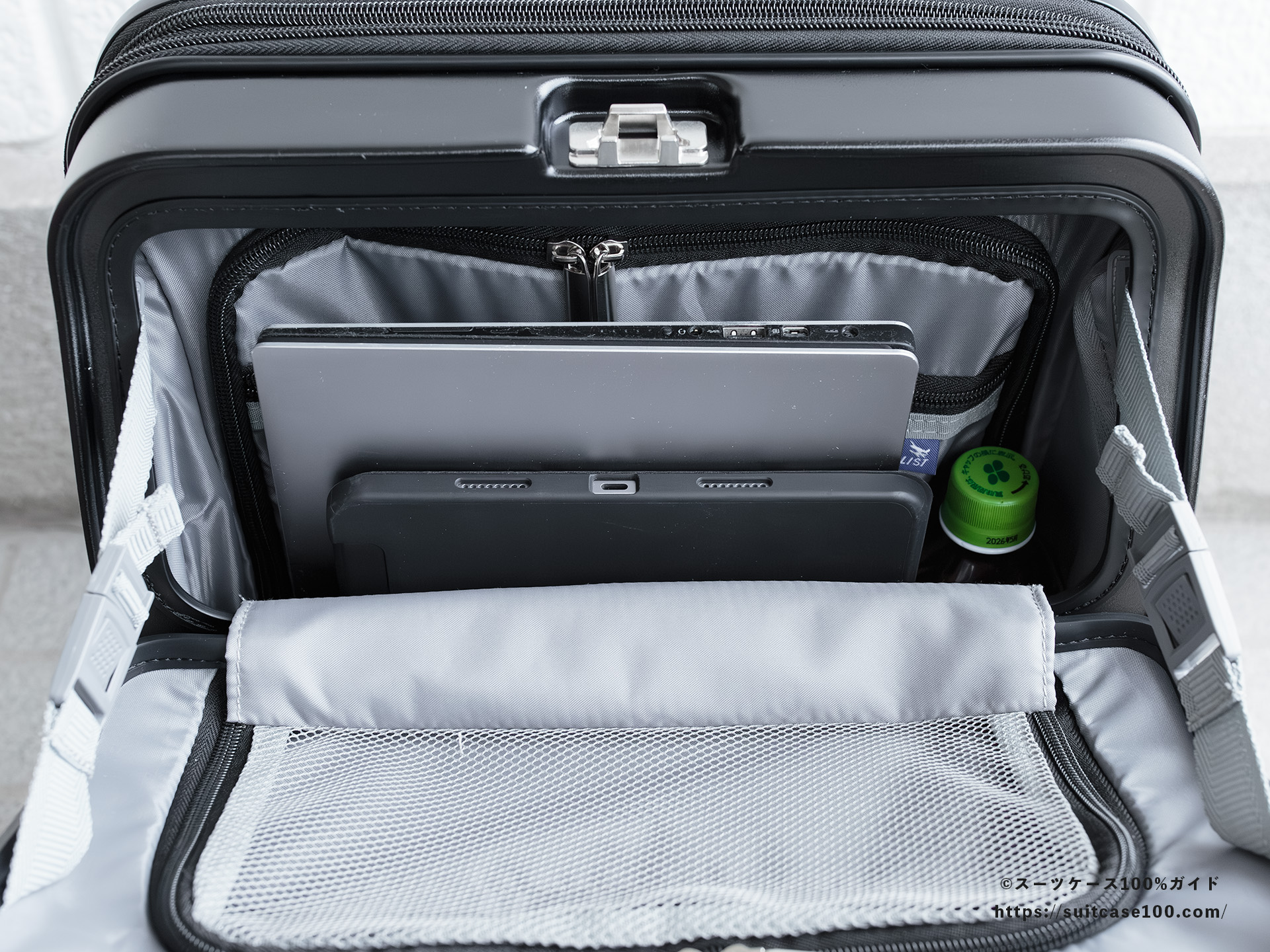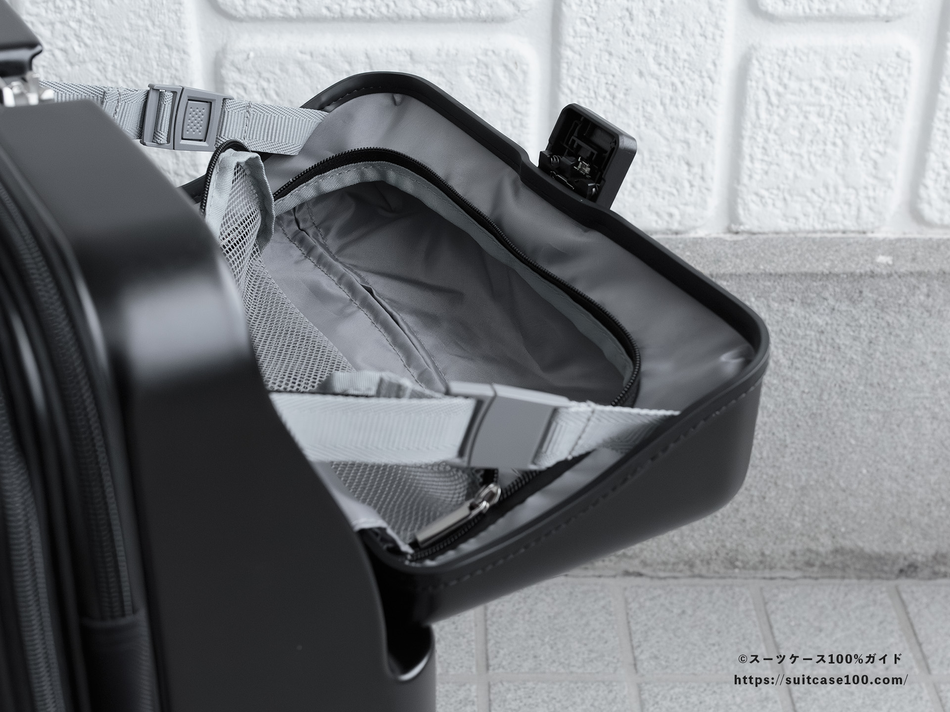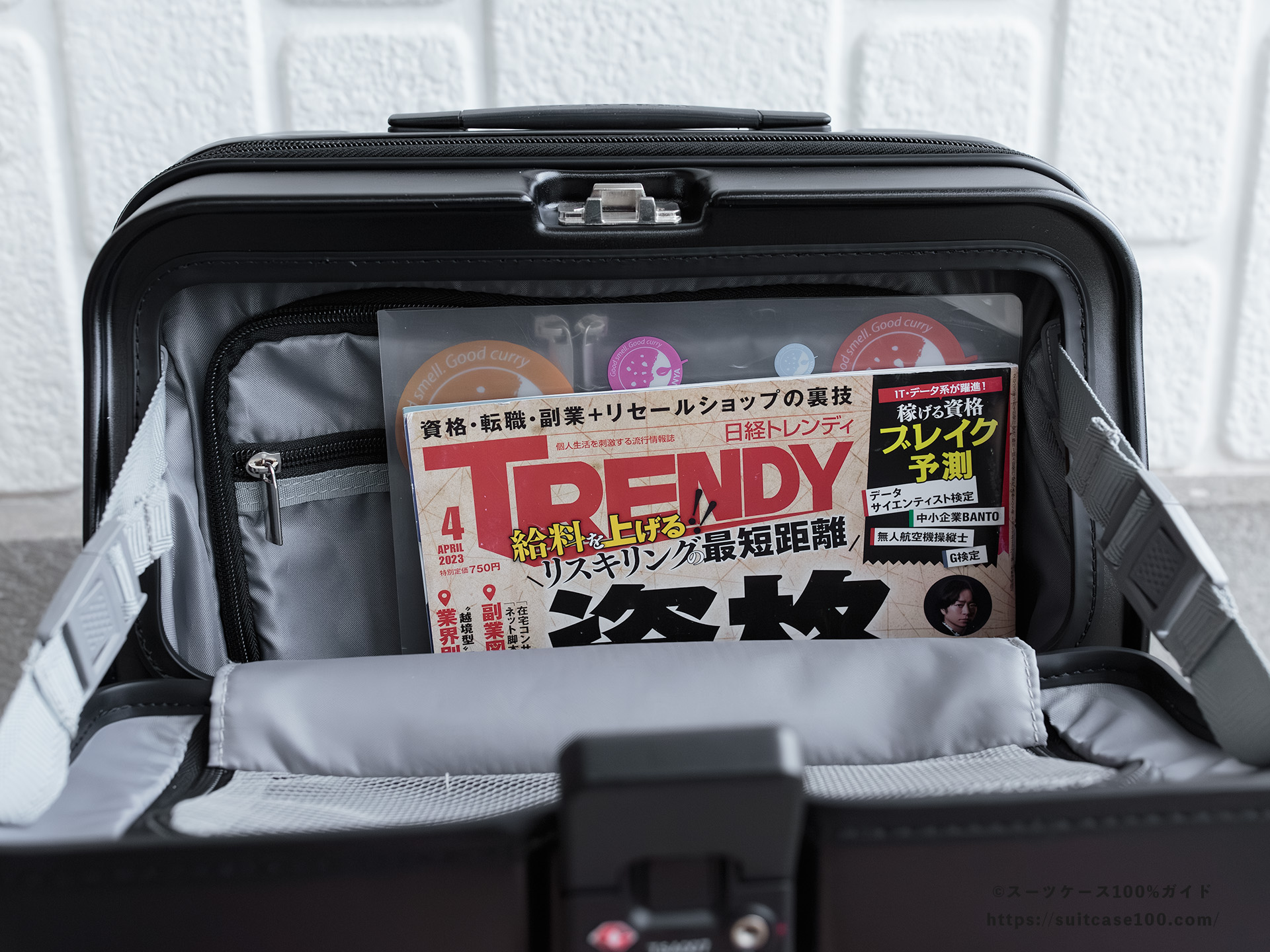 機内持ち込みとワンタッチTSAロックの説明。