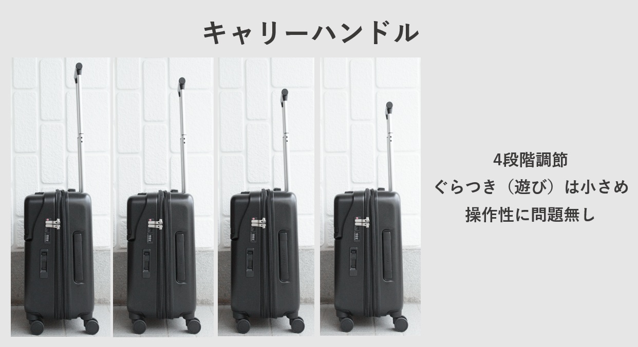 | キャリーハンドル | 〇 | ぐらつき小さめ。4段階調節。持ち心地が△ |