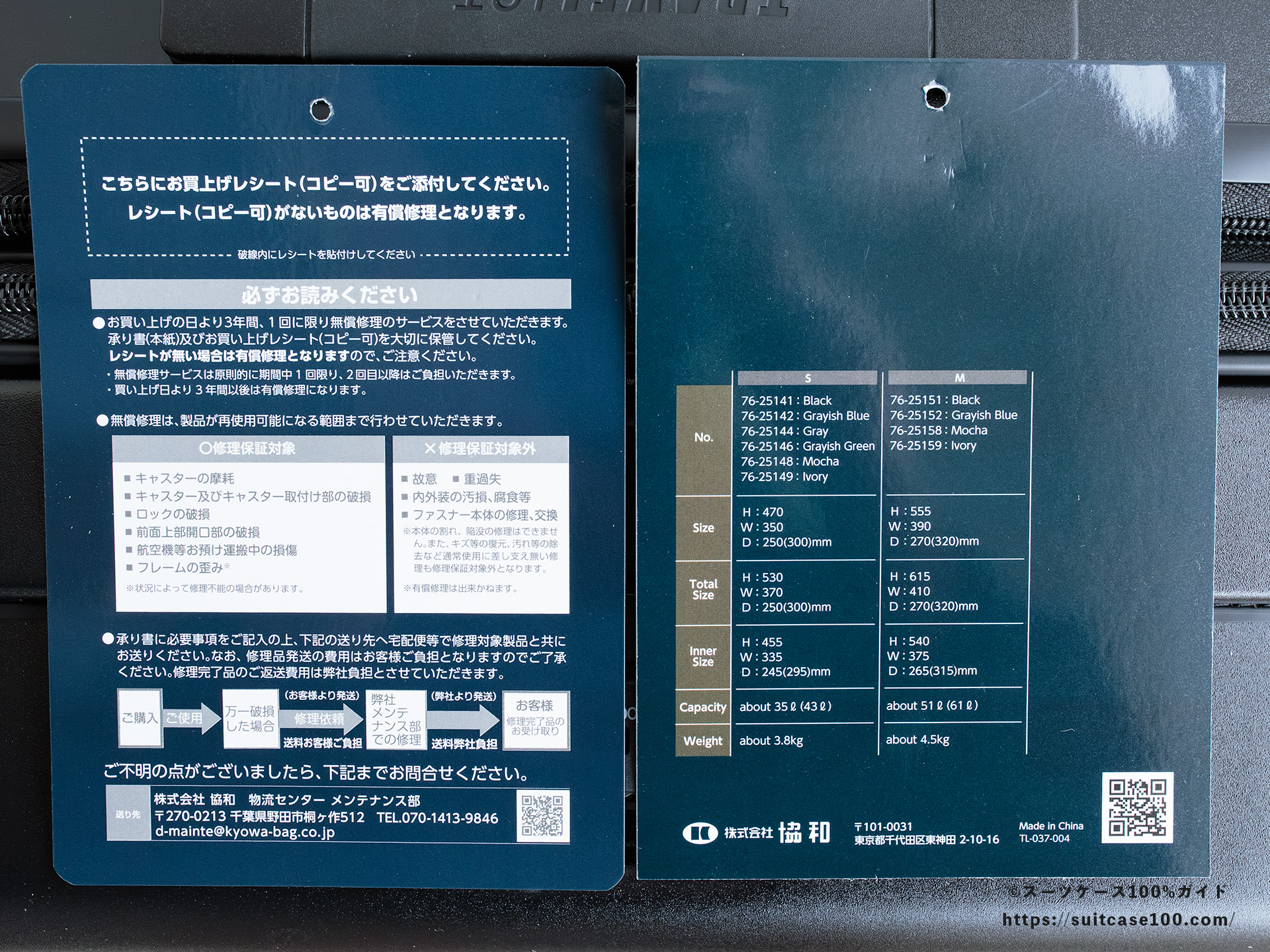 裏面は保証の詳細とスペック表。