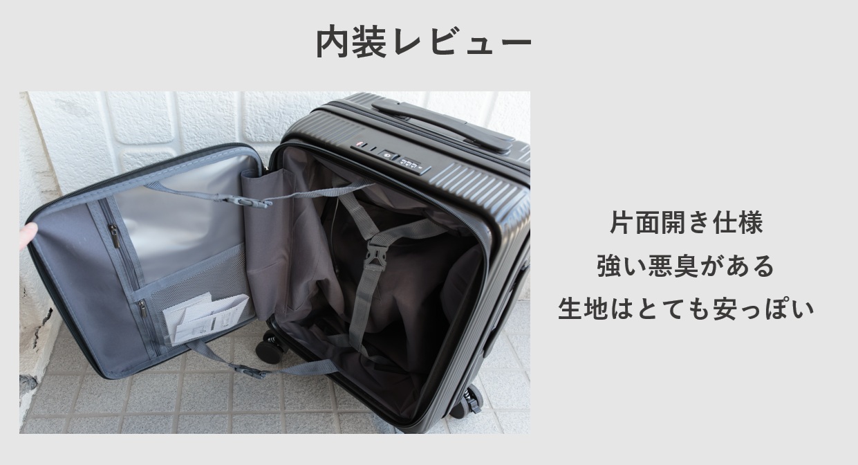 | 内装 | × | 強い悪臭。生地が安っぽい |