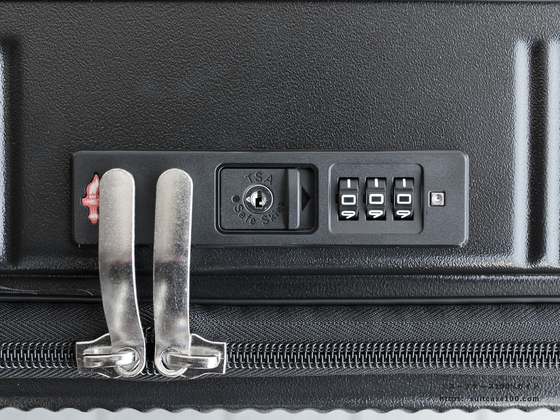 TSAロックはダイヤル式。珍しい「Safe Skies」社製。