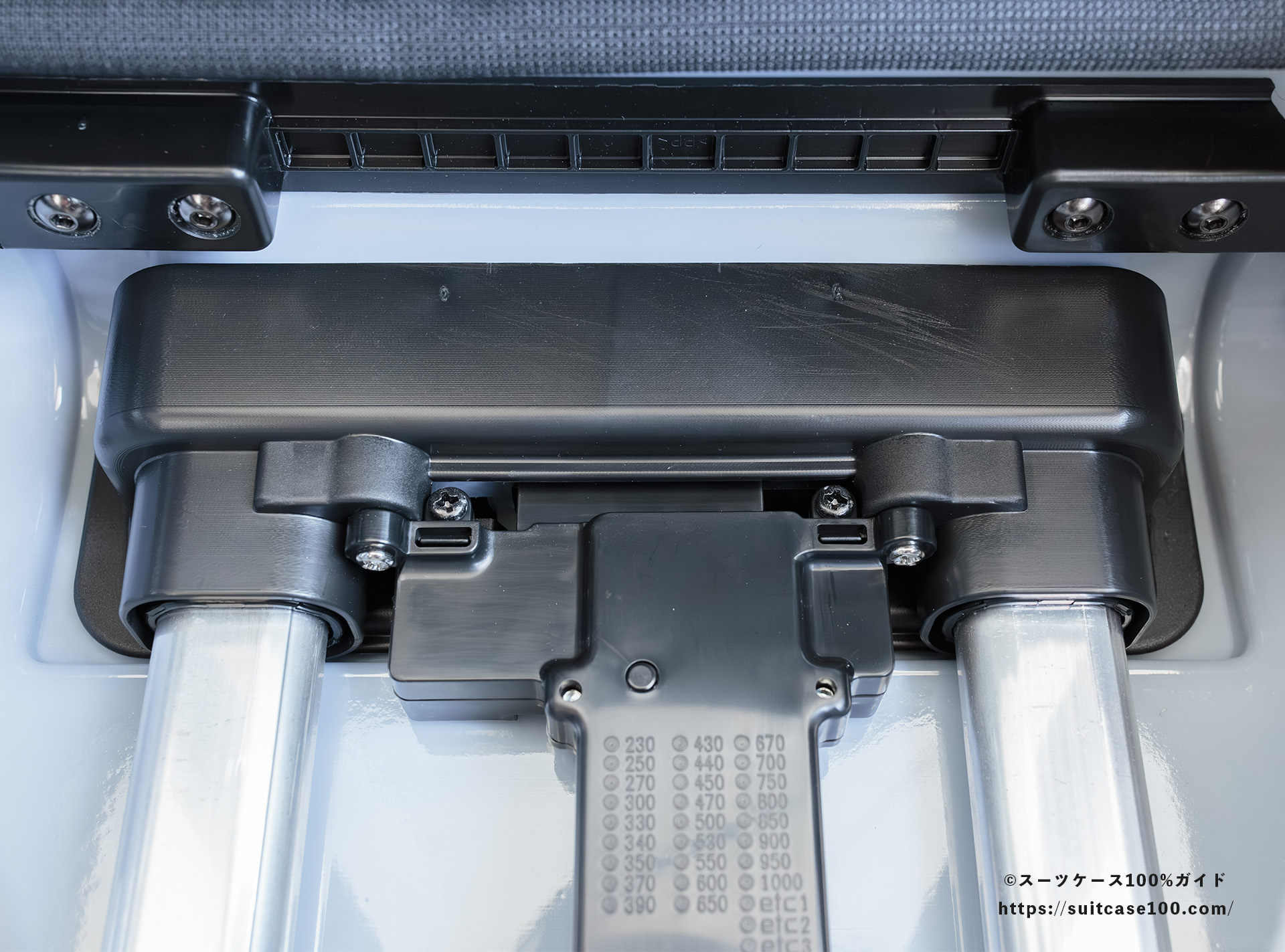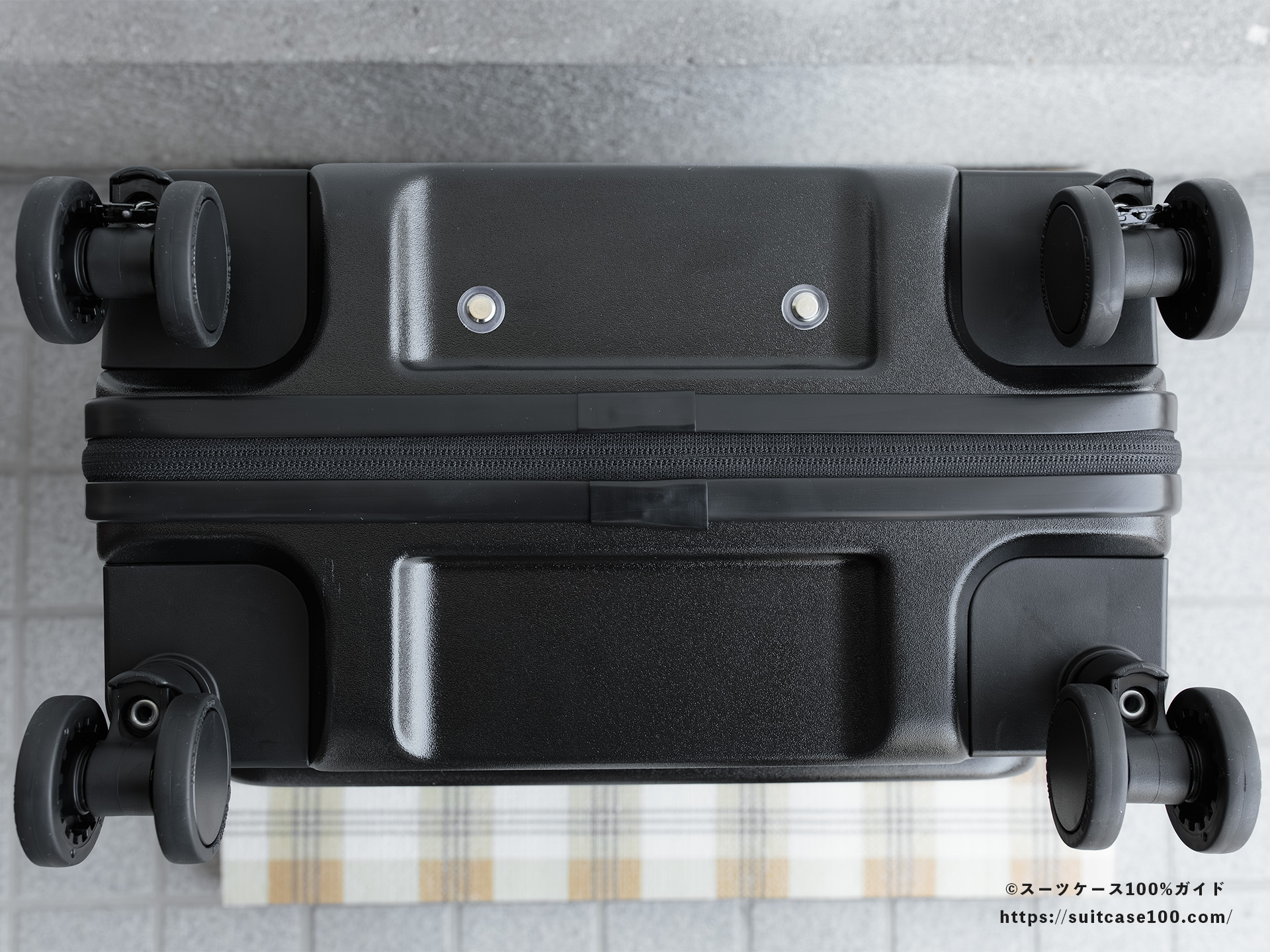 底鋲もサイドハンドルも無いので、本体は機内持ち込みのほぼ限界サイズ。