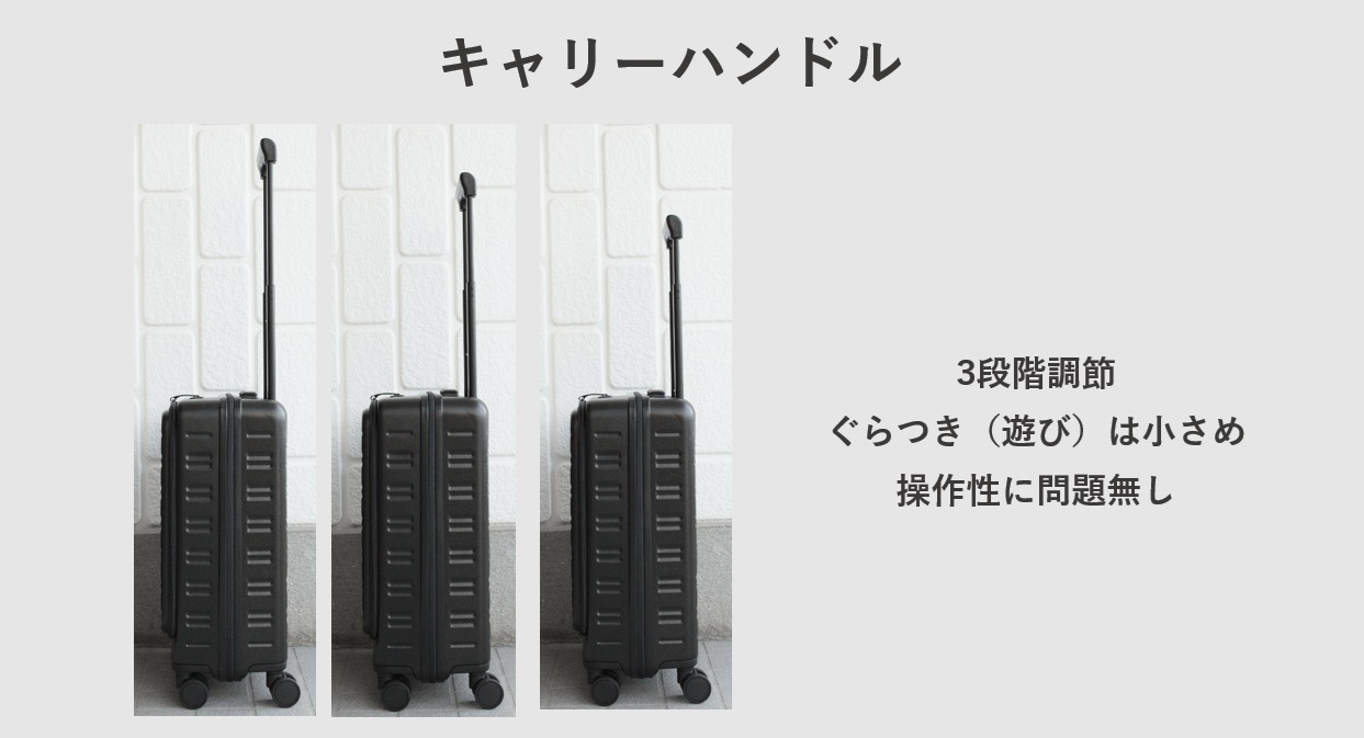 | キャリーハンドル | 〇 | ぐらつき小さめ。3段階調節。 |