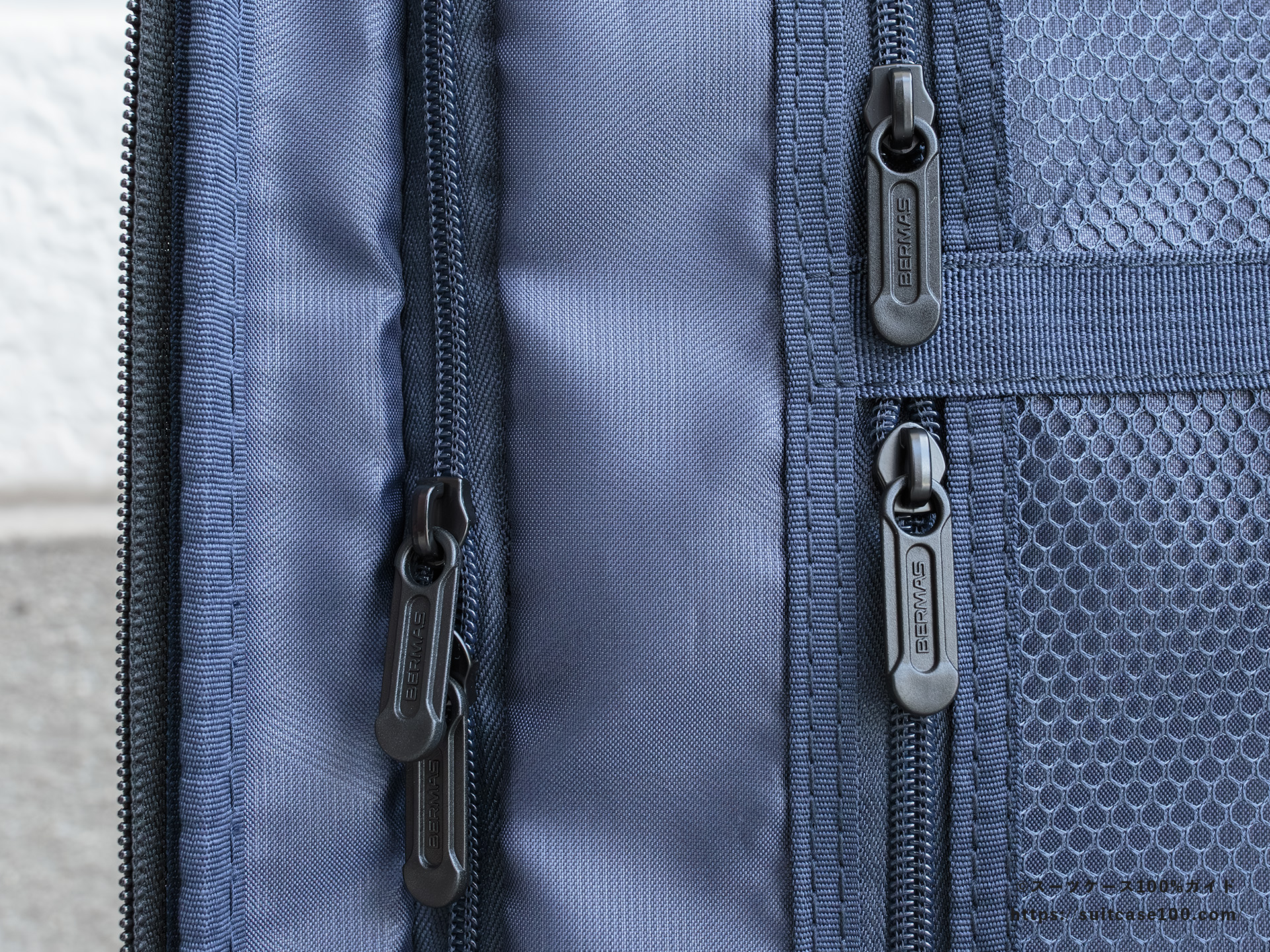 ファスナーの引手はバーマス新開発の「3軸式スイベルタイプ」を採用。
