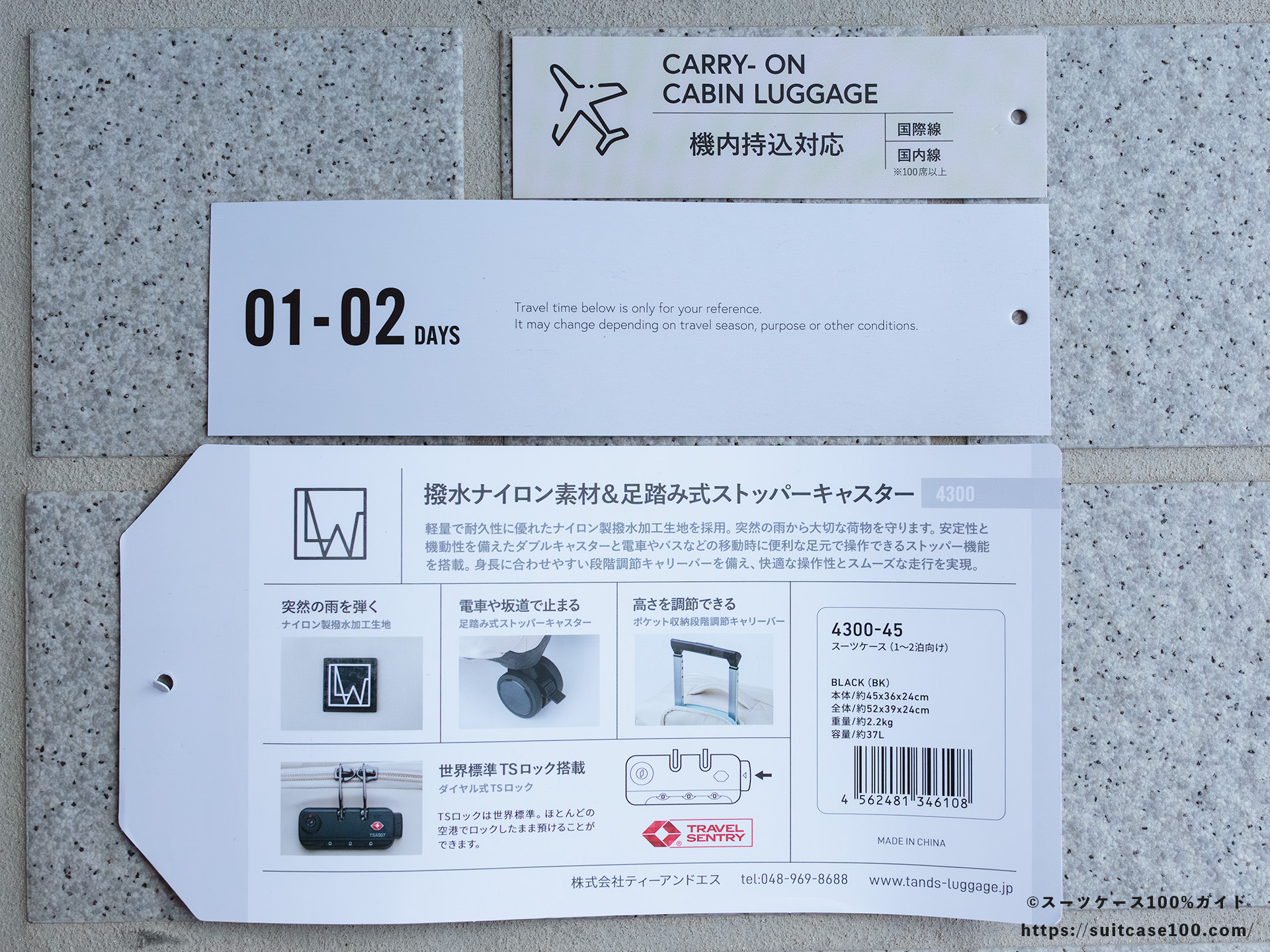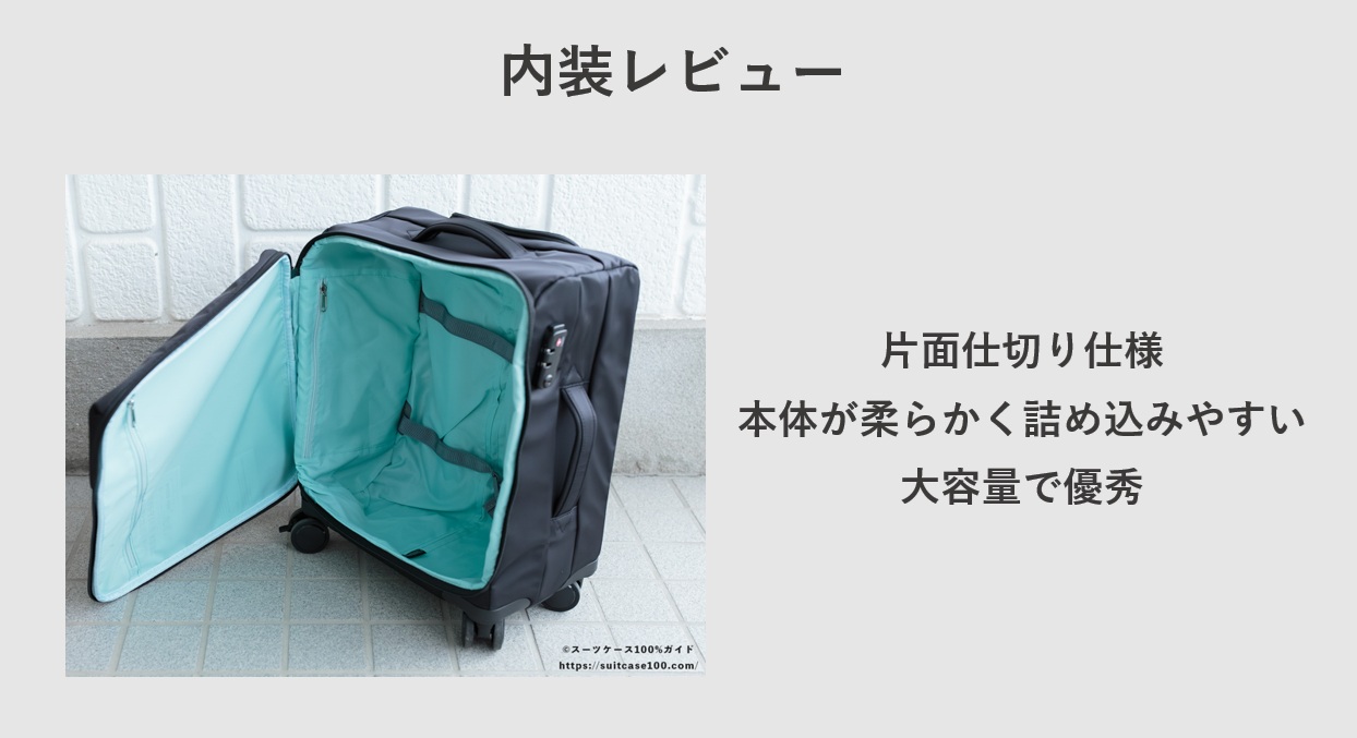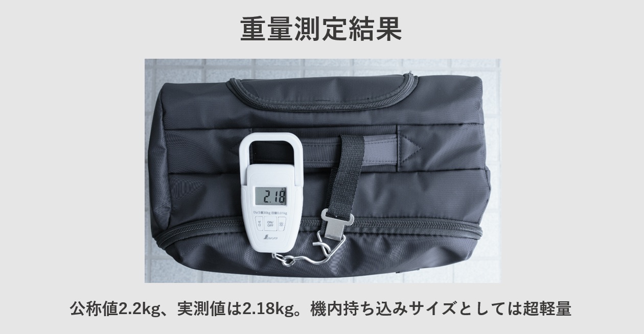 機内持ち込み最大の大容量で、実測値2.18kgと超軽量なのが良い点。