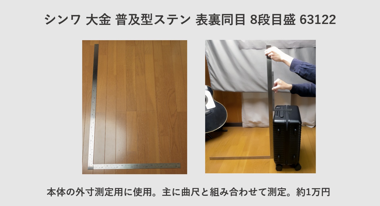 当サイトではシンワ測定製の1mの大型曲尺にて総外寸を測定しています。